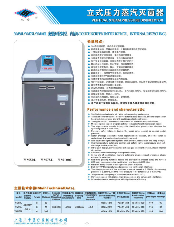 YM50L/YM75L/YM100L智能灭菌设备采用触控操作界面,配置7英寸液晶显示屏,支持温度参数在105-135℃区间调节。该系列产品通过压力容器安全认证(设计压力0.25MPa),符合简单压力容器使用规范。